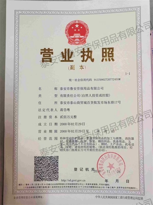泰安市魯安勞保用品有限公司是一家從事勞保用品、勞保用品批發(fā)的企業(yè),公司成立于2000年2月,為增值稅一般納稅人,同年,經(jīng)主管安全生產(chǎn)的有關(guān)部門(mén)批準(zhǔn)同意,經(jīng)營(yíng)銷(xiāo)售特種勞動(dòng)防護(hù)用品,并獲得山東省安全生產(chǎn)監(jiān)督管理局頒發(fā)的《山東省勞動(dòng)防護(hù)用品經(jīng)營(yíng)條件資格認(rèn)可證》證書(shū)編號(hào):HY-J.001。
